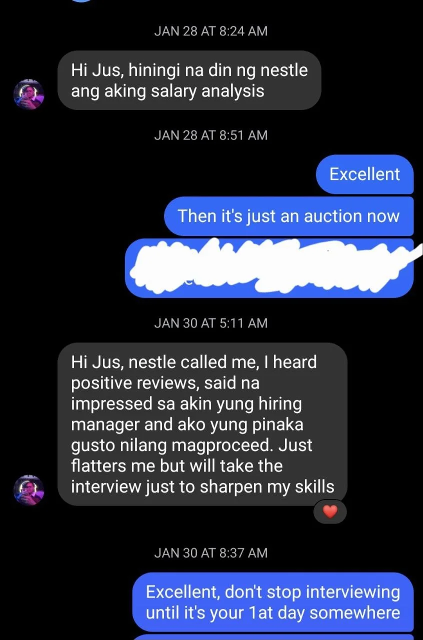 The updates I got from Adrian were all about him being invited to interviews, with his dream companies responding back (though being a confusing with their calendars). I had no worries about Adrian because I knew he’d do great, I just needed him to keep me in the loop before responding to make sure we were positioning him properly.